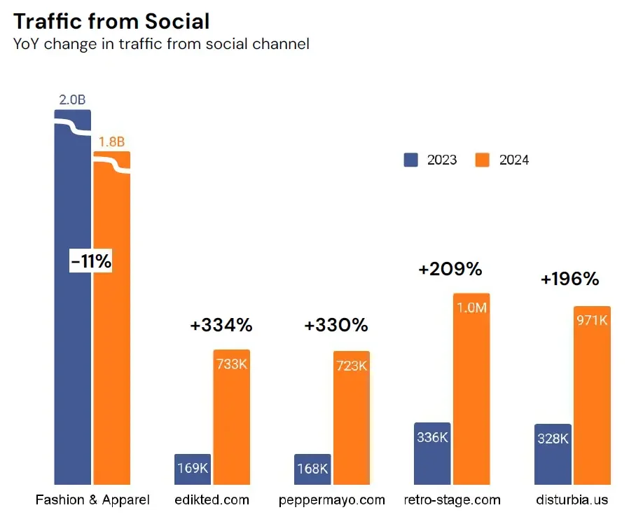 Τα social media αποδείχθηκαν ο ακρογωνιαίος λίθος του μάρκετινγκ το 2024, ιδιαίτερα στις κατηγορίες μόδας και ομορφιάς. Η Peppermayo.com, για παράδειγμα, πέτυχε τετραπλάσια αύξηση της επισκεψιμότητας από κοινωνικά δίκτυα, χάρη σε συνεργασίες με influencers και καμπάνιες hashtag.