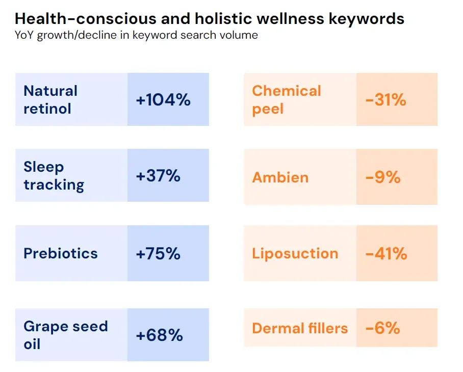 Η υγεία και η ευεξία αναδείχθηκαν σε κεντρικούς πυλώνες της καταναλωτικής συμπεριφοράς το 2024, μια τάση που θα συνεχιστεί και το 2025. Η έκθεση αναφέρει ότι οι κορυφαίες εφαρμογές στις κατηγορίες Beauty & Wellness και Consumer Electronics επικεντρώνονται σε λύσεις που προάγουν την ολιστική ευεξία, όπως εφαρμογές για διαλογισμό, trackers ύπνου και καθαρή διατροφή. Επιπλέον, οι αναζητήσεις για φυσικά συστατικά και μη επεμβατικές λύσεις (π.χ. «φυσική ρετινόλη» +37%, «προβιοτικά» +75%) δείχνουν μια σαφή στροφή μακριά από χημικά και χειρουργικές επεμβάσεις.